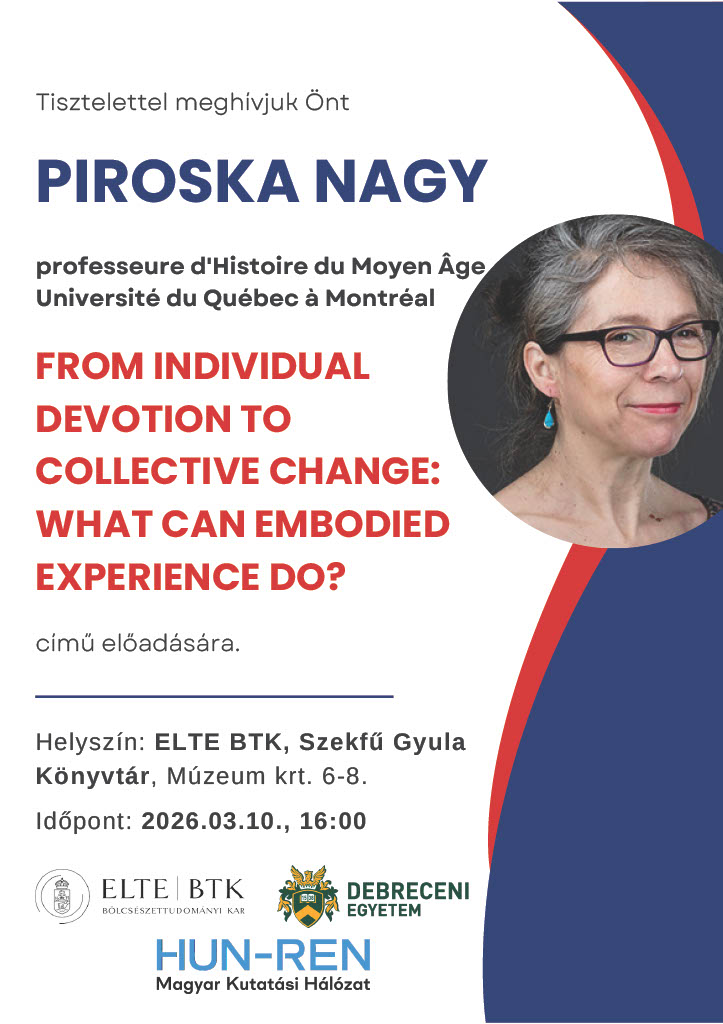 A HUN-REN – DE Középkori Magyarország és Közép-Európa Hadtörténete Kutatócsoport meghívására érkezett Magyarországra Piroska Nagy (professeure d’Histoire du Moyen Âge Université du Québec à Montréal), akivel a kutatócsoport közös kutatási projekten dolgozik és szakmai együttműködést alakít ki. A Professzor tiszteletére „FROM INDIVIDUAL DEVOTION TO COLLECTIVE CHANGE: WHAT CAN EMBODIED EXPERIENCE DO?” címmel előadást szerveztek.